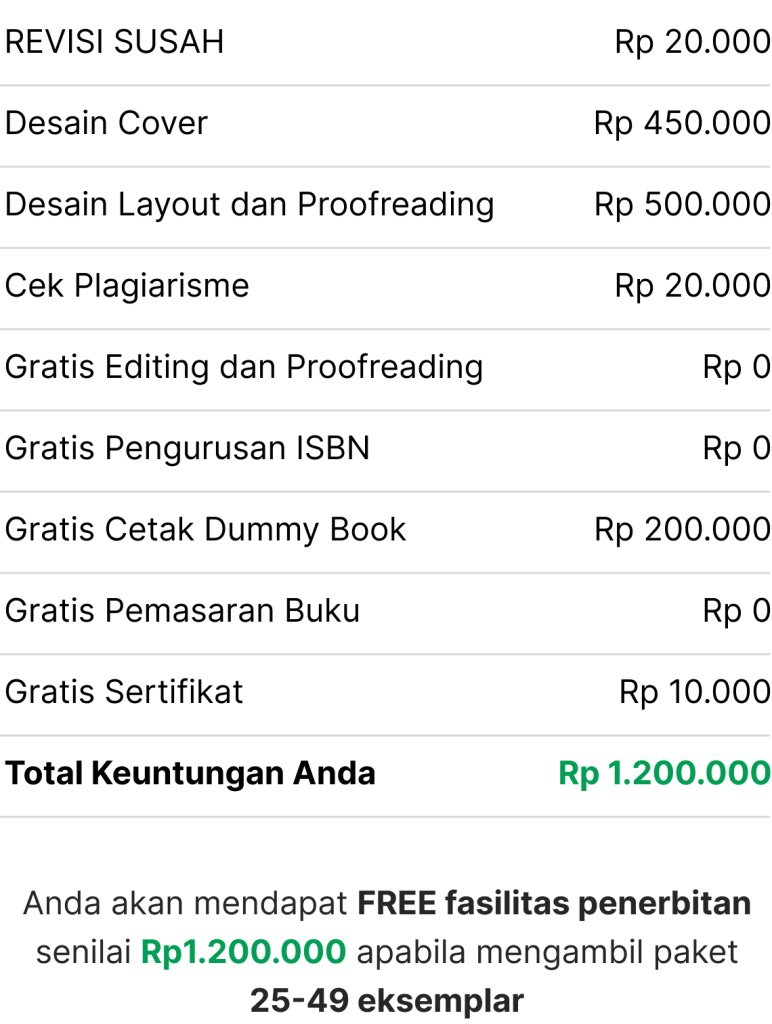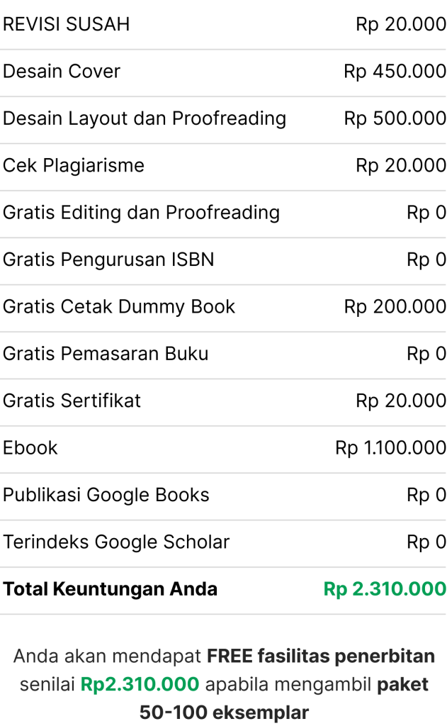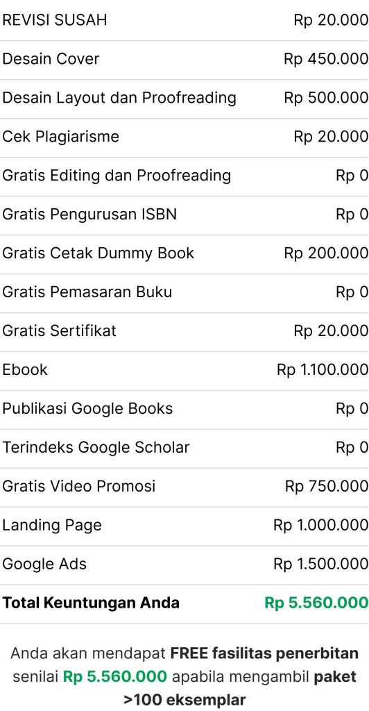 Dapatkan fasilitas penerbitan GRATIS dan lengkap yang akan mendukung setiap langkah perjalanan buku Anda bersama kami.